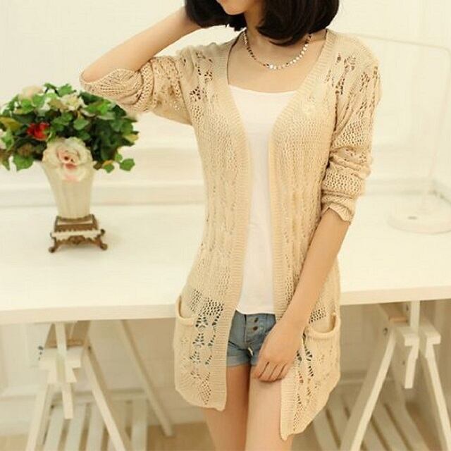 レディース 薄手 ロング ニット Vネック カーディガン 長袖 夏 日焼け UV 対策 ( ベージュ )