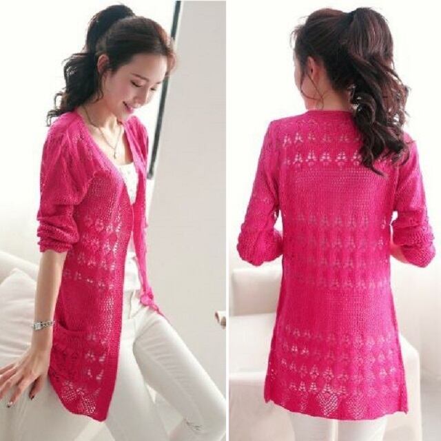 レディース 薄手 ロング ニット Vネック カーディガン 長袖 夏 日焼け UV 対策 ( ローズ )