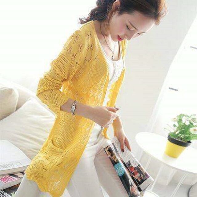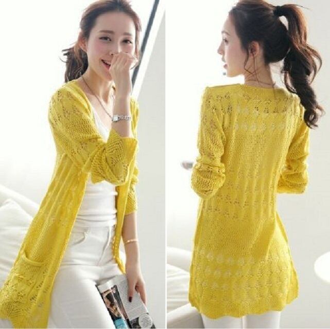 レディース 薄手 ロング ニット Vネック カーディガン 長袖 夏 日焼け UV 対策 ( イエロー )
