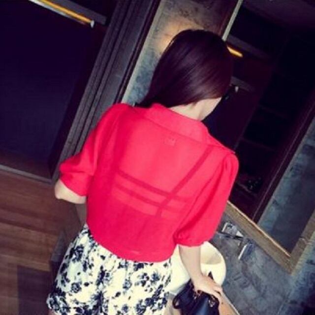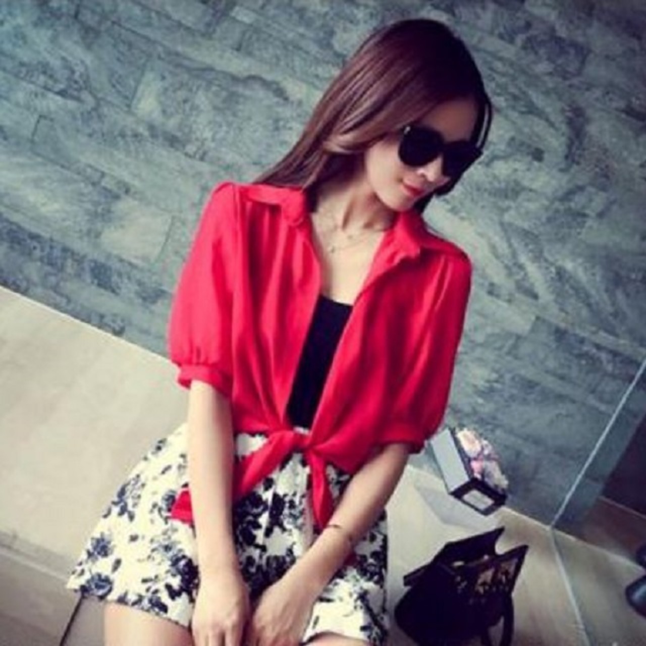レディース 薄手 ウエスト 前結び スタイルUP シャツ 半袖 夏 日焼け UV 対策 ( レッド )