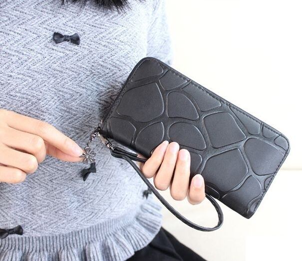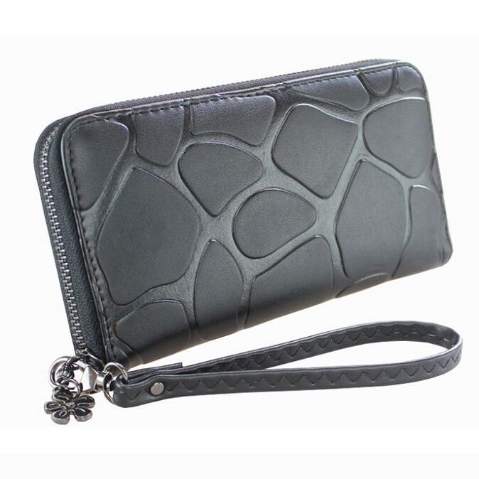 エレガント ロング ウォレット レディース 長財布 PU レザー 花 ストラップ 付き ( ブラック )