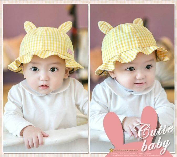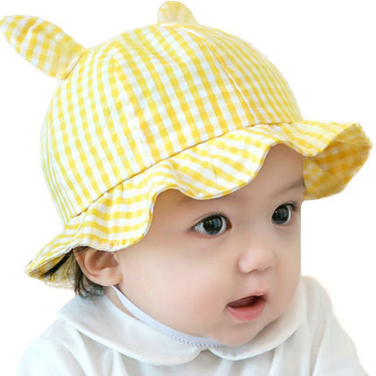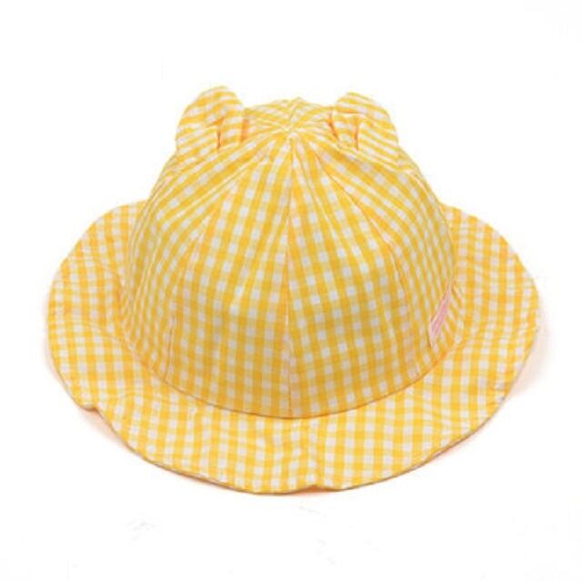 かわいい 耳付き 赤ちゃん 帽子 チェック柄 女の子 男の子 夏 紫外線 UV 防止 日除け ベビー ハット ( イエロー )