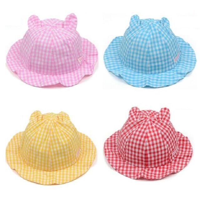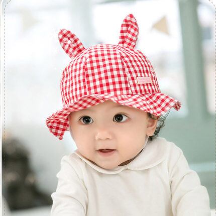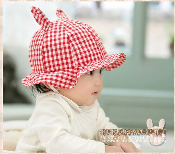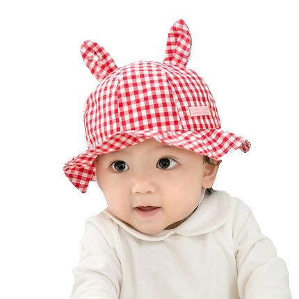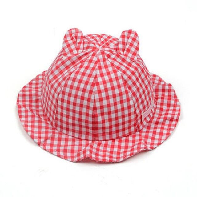 かわいい 耳付き 赤ちゃん 帽子 チェック柄 女の子 男の子 夏 紫外線 UV 防止 日除け ベビー ハット ( レッド )