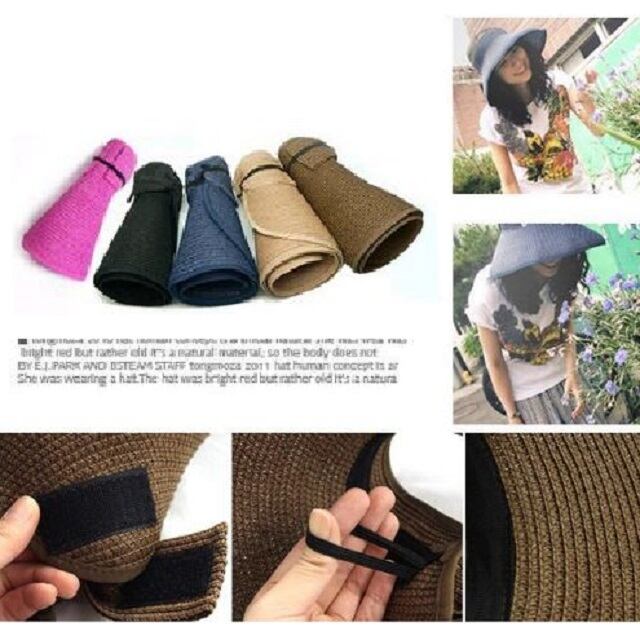 折りたたみ つば広 ストロー ハット レディース 夏 UV 紫外線 防止 麦わら 帽子 ( ブラック )