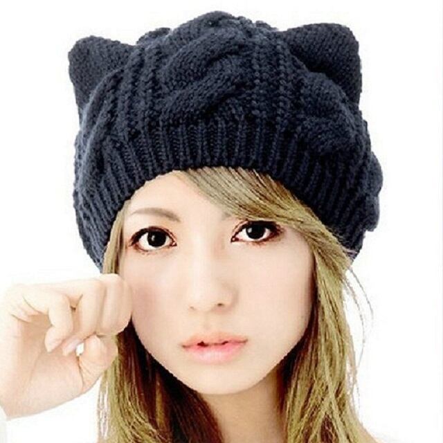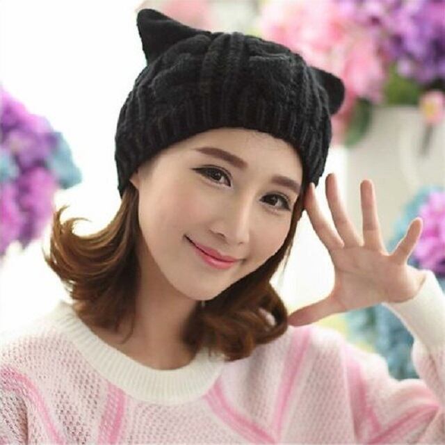かわいい 猫耳 編み込み ニット帽 あったか レディース カジュアル 5色 ねこ 秋 冬 春 ( ブラック )