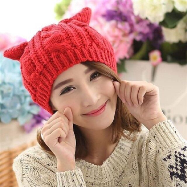 かわいい 猫耳 編み込み ニット帽 あったか レディース カジュアル 5色 ねこ 秋 冬 春 ( レッド )