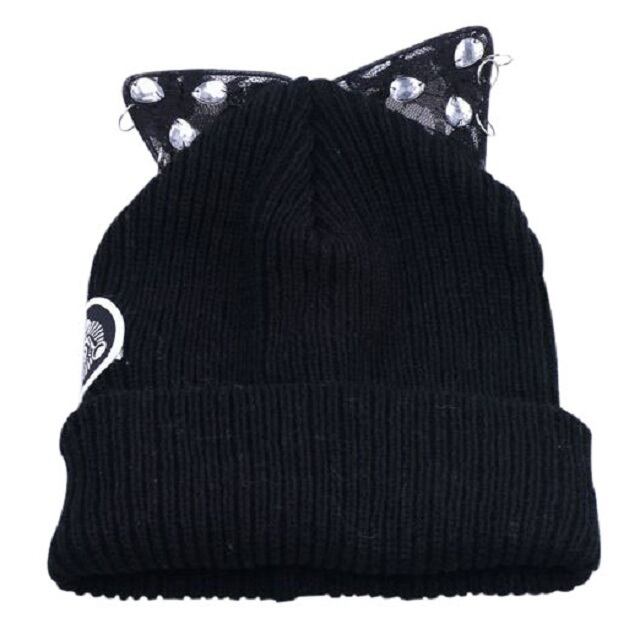 かわいい 猫耳 ピアス 付き ニット帽 レディース カジュアル ねこ 秋 冬 ( ブラック )