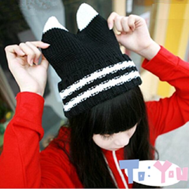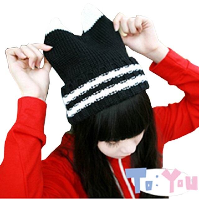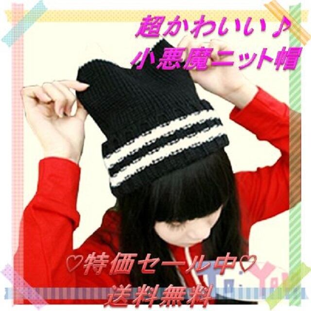 小悪魔 ニット帽 猫耳 ねこ ツートン ニットキャップ レディース 帽子 秋 冬 ( ブラック×ホワイト )