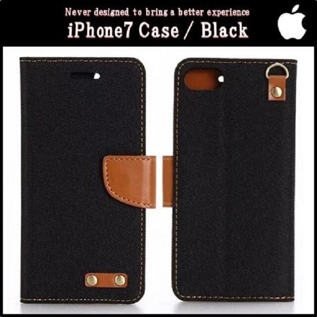 iPhone7 4.7インチ おしゃれ 手帳型 スマホ ケース キャンバス生地 カバー (ブラック)