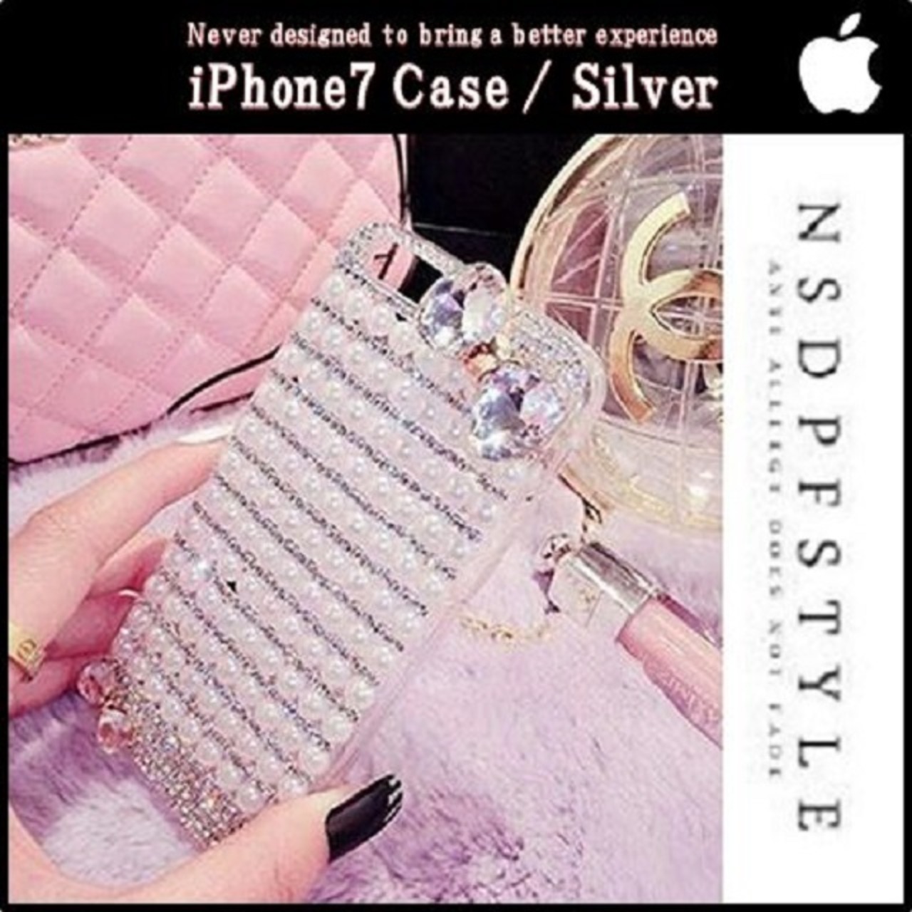iPhone7 ケース ラインストーン&パール キラキラ デコ リボン スマホ カバー (シルバー)
