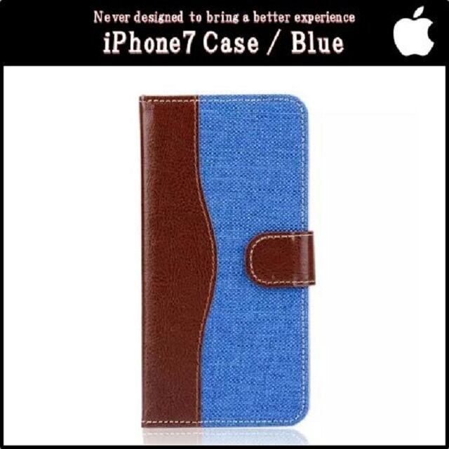 iPhone7 4.7インチ 手帳型 スマホ ケース PUレザー キャンバス生地 カバー (ブルー)
