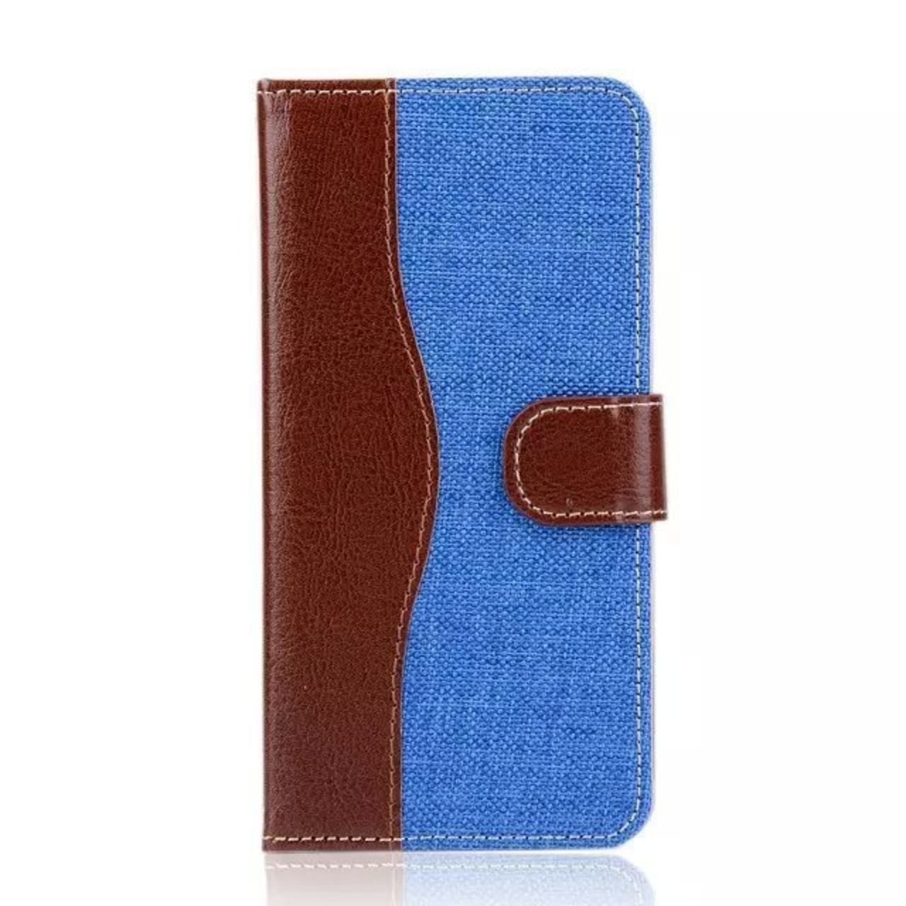 iPhone7 Plus 5.5インチ 手帳型 スマホ ケース PUレザー キャンバス生地 カバー (ブルー)