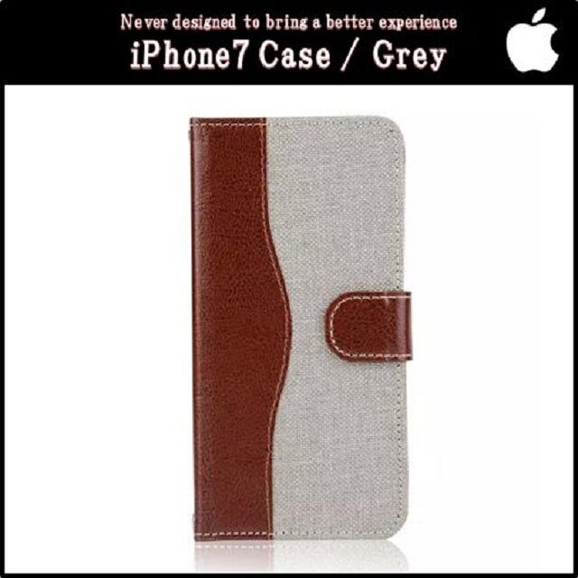 iPhone7 4.7インチ 手帳型 スマホ ケース PUレザー キャンバス生地 カバー (グレー)