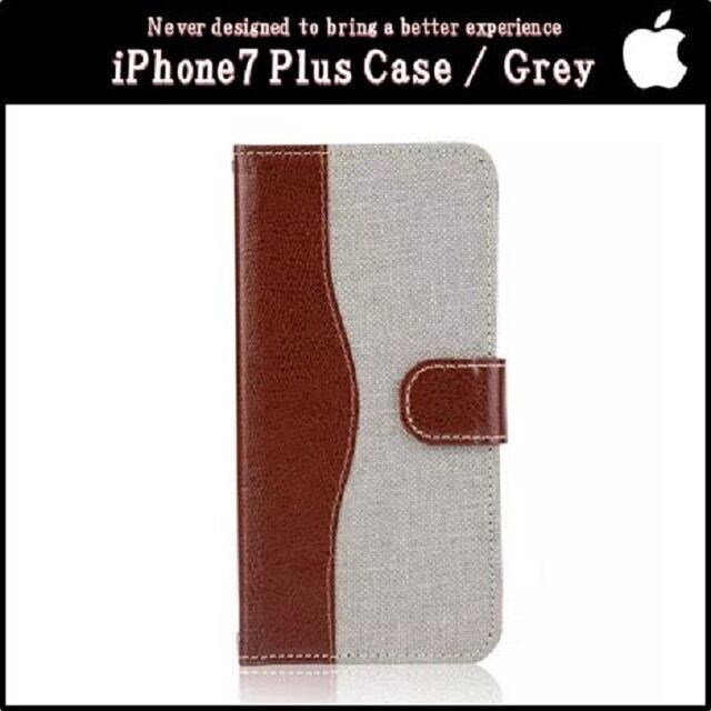 iPhone7 Plus 5.5インチ 手帳型 スマホ ケース PUレザー キャンバス生地 カバー (グレー)