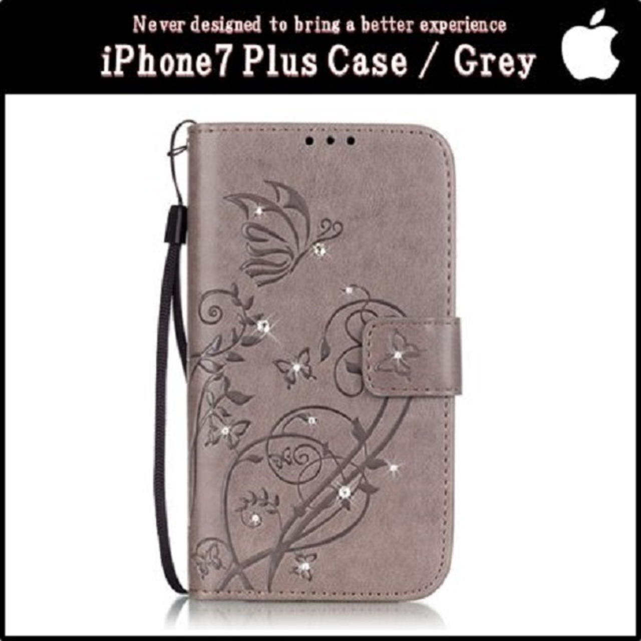iPhone7 Plus 5.5インチ 手帳型 スマホ ケース 花×蝶々 ラインストーン デザイン PUレザー カバー ( グレー )