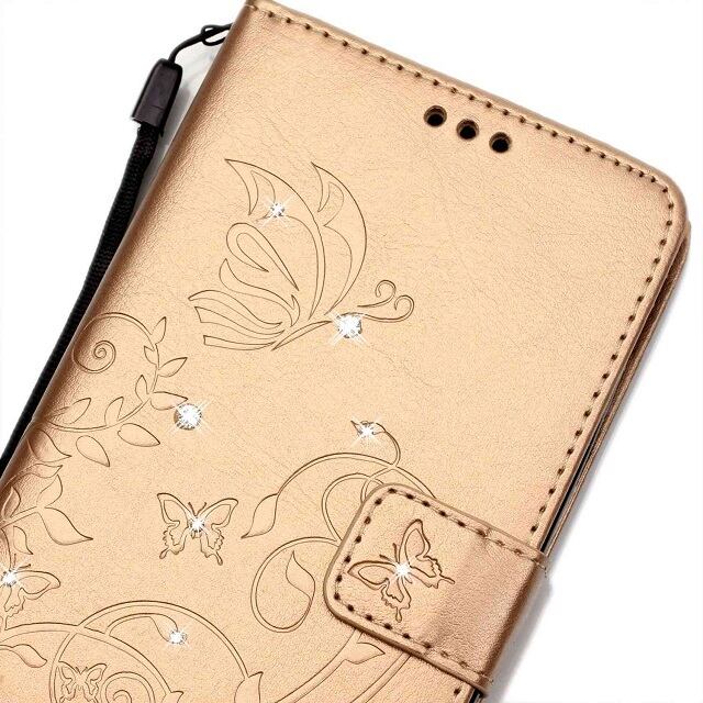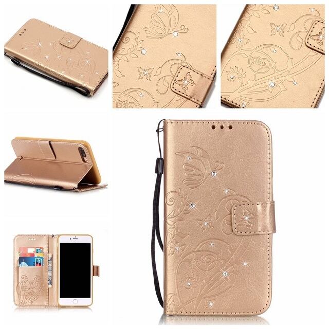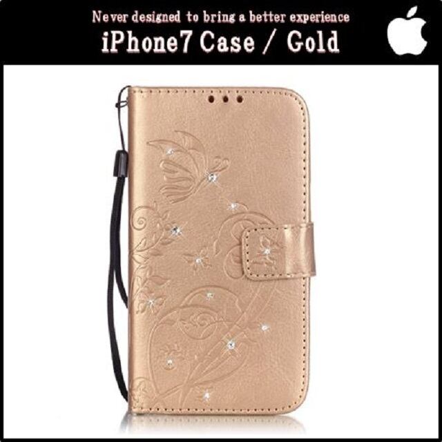 iPhone7 4.7インチ 手帳型 スマホ ケース 花×蝶々 ラインストーン デザイン PUレザー カバー ( ゴールド )