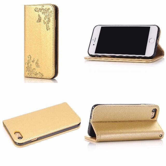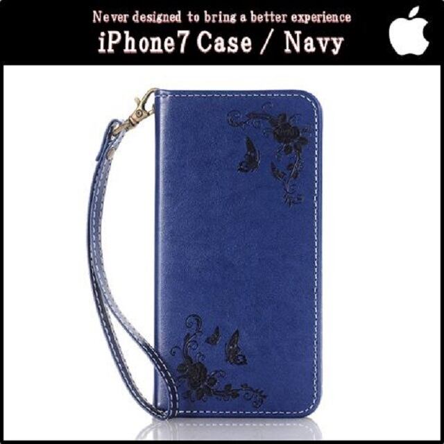 iPhone7 4.7インチ 手帳型 スマホ ケース 花×蝶々 シンプル 刺繍 デザイン PUレザー カバー ( ネイビー )