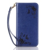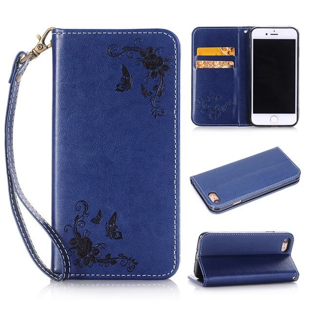 iPhone7 Plus 5.5インチ 手帳型 スマホ ケース 花×蝶々 シンプル 刺繍 デザイン PUレザー カバー ( ネイビー )